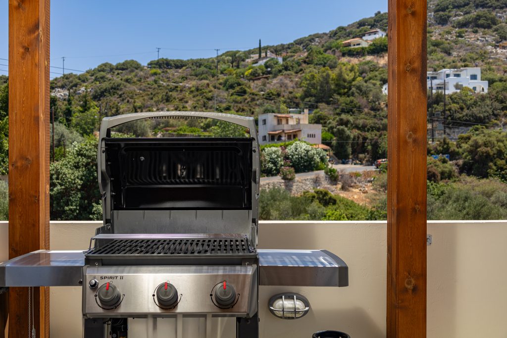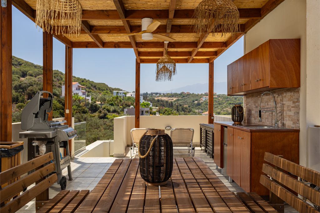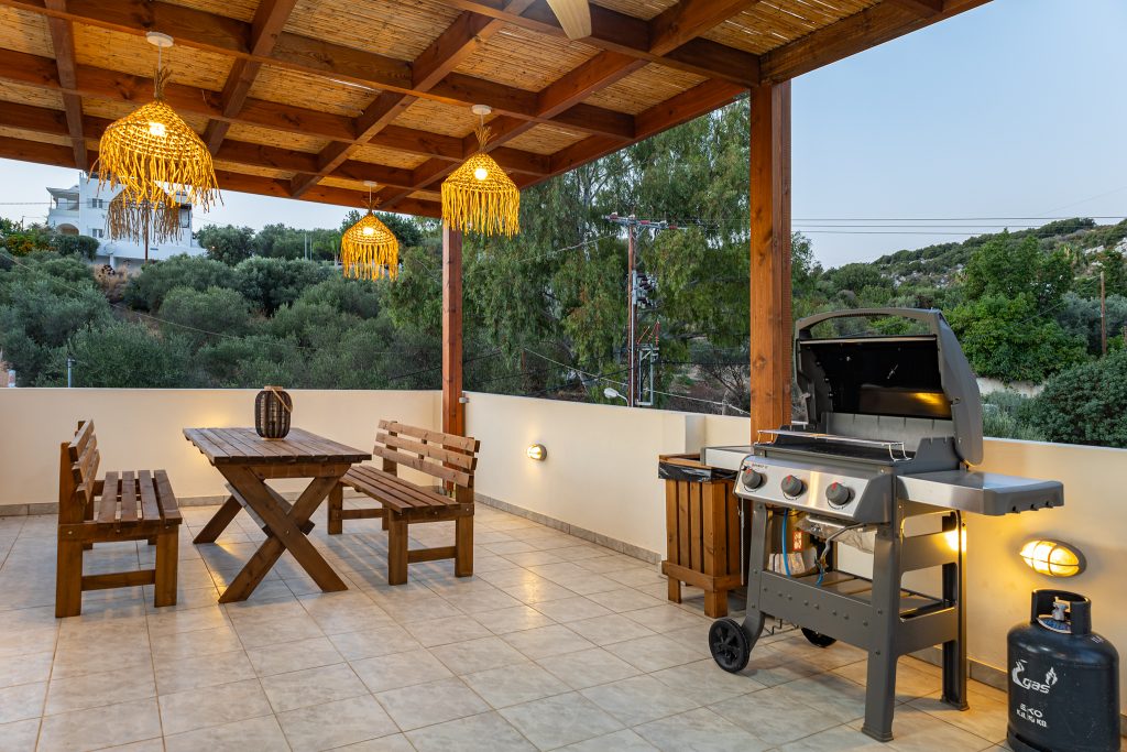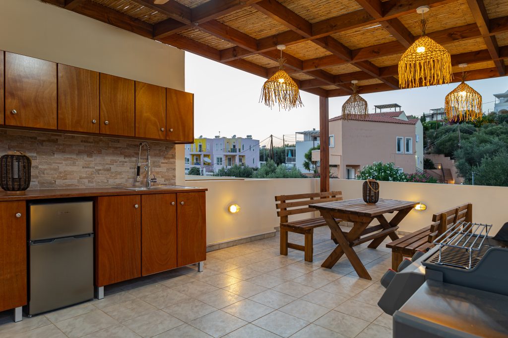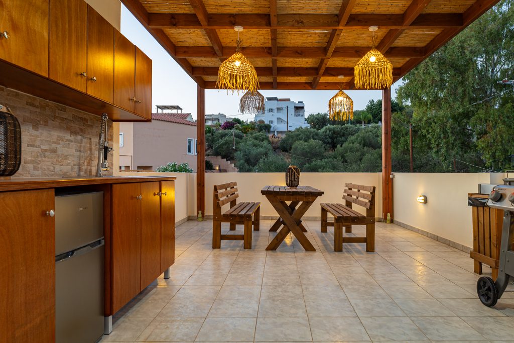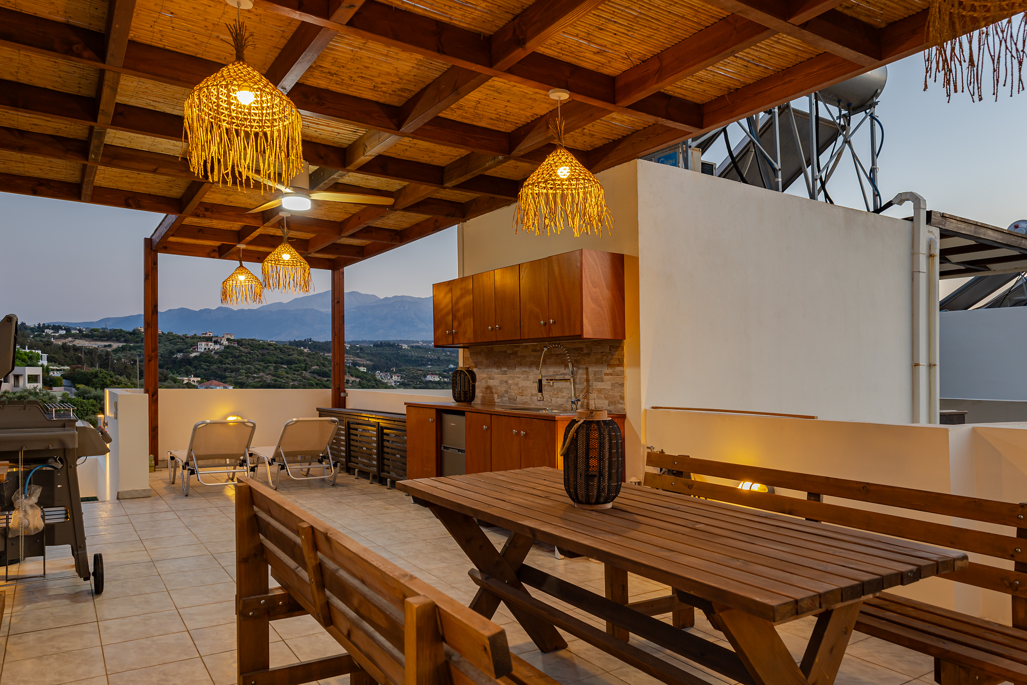 The roof terrace is a highlight! Once you walk up the stairs from the bedroom on the first floor, you will discover a cute area, where small details invite you to hang out. The pergola grants shadow all day long and a large hand-made wooden table invites you, family and friends to enjoy sunset, the view at the White Mountains or the partial sea view. We have placed a small kitchenette on the roof with everything you may need for a BBQ, so that you will not have to bother about carrying staff around the house.
